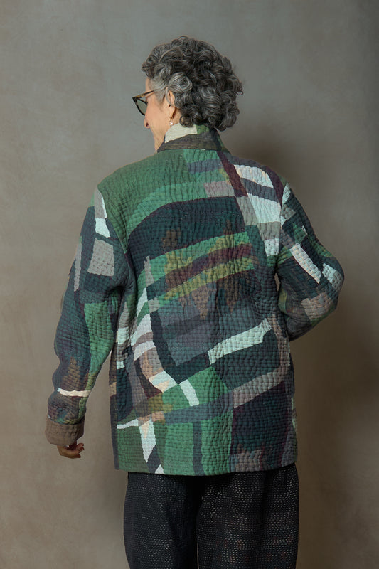 ABSTRACT AND DUCK CLOTH KANTHA HIGH-NECK CROPPED JACKET - ap5095-grn -