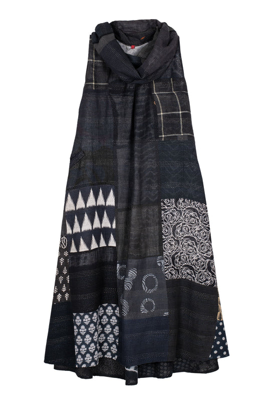 VINTAGE BOTTOM PRINT KANTHA COWL NECK MAXI DRESS - vb2438-blk -