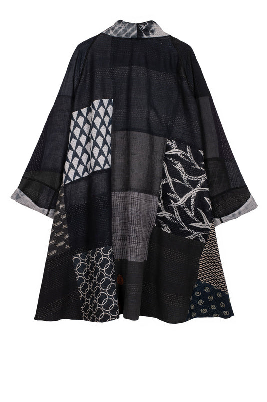VINTAGE BOTTOM PRINT KANTHA KIMONO LONG JACKET - vb2005-blk -