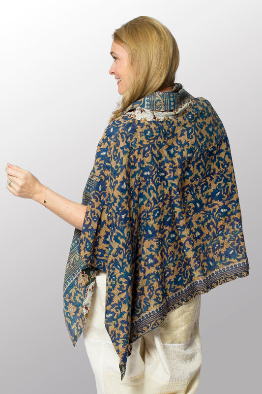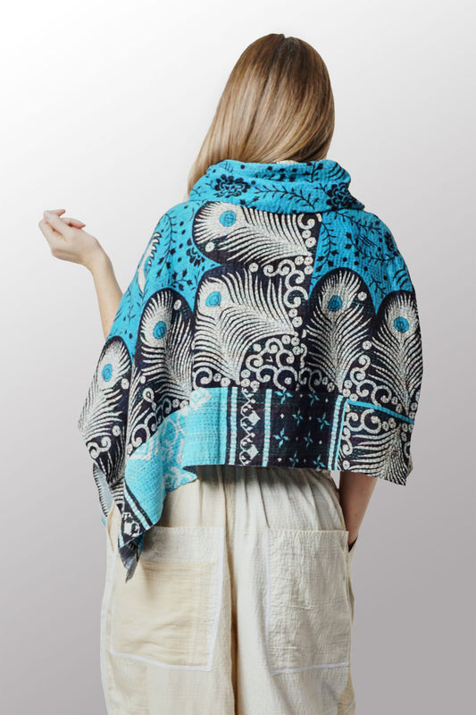VINTAGE COTTON KANTHA COWL NECK WIDE CAPE - cv2843-blu -