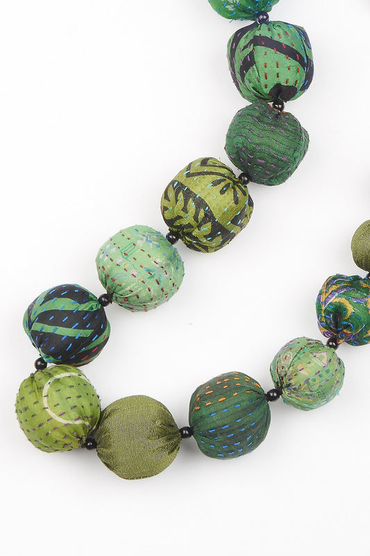 VINTAGE SILK KANTHA NUTS LONG NECKLACE - sv2702-grn -