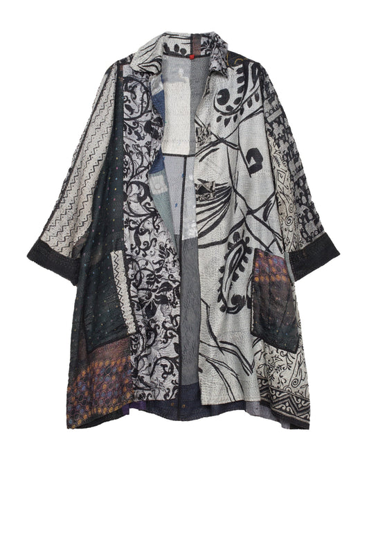 VINTAGE SILK PATCH KANTHA A-LINE DUSTER - vp2311-blk -