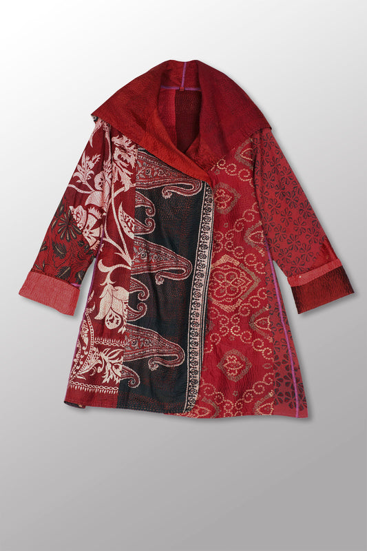 VINTAGE SILK PATCH KANTHA A-LINE COAT P - vp2336-red -
