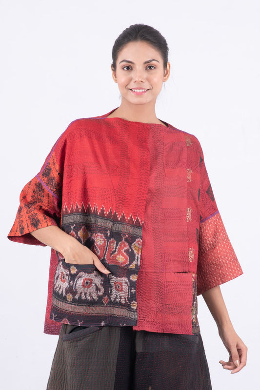 VINTAGE SILK PATCH KANTHA POCKET JKT - vp2002-red -