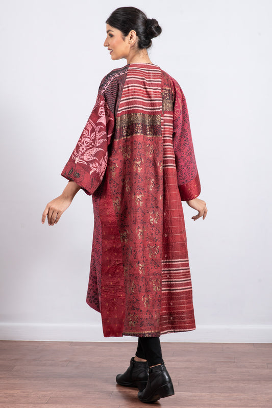 VINTAGE SILK PATCH KANTHA KIMONO MAXI - vp2318-red -