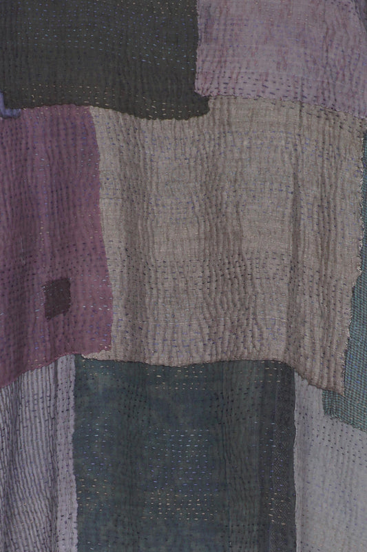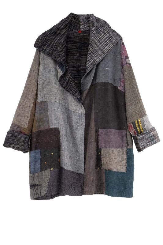 WOVEN IKAT & FRAYED PATCH KANTHA A-LINE COAT - wk4309-gry -