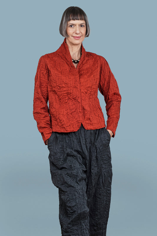 DYED COTTON SILK HEAVY VOILE RANDOM TUCK HIGH-NECK BLOUSE - dr1563-red -