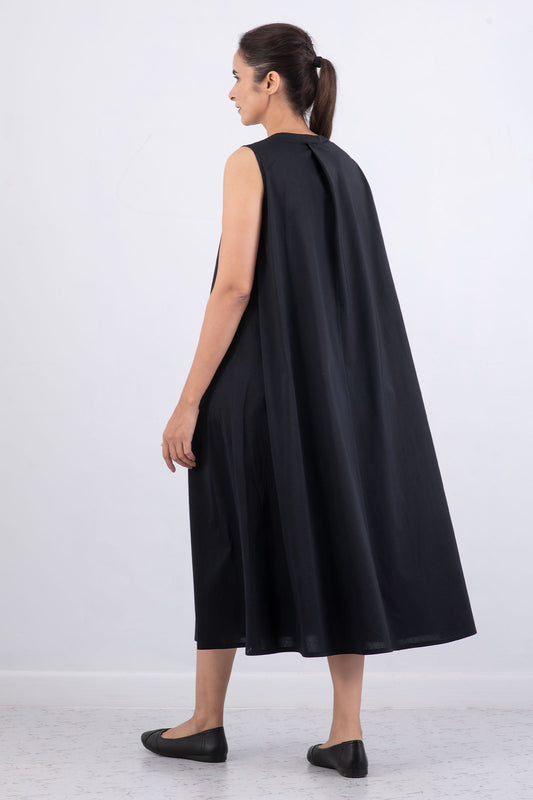 DYED COTTON SILK HEAVY VOILE RANDOM TUCK V-NECK BALLON DRESS - dr1451-blk -
