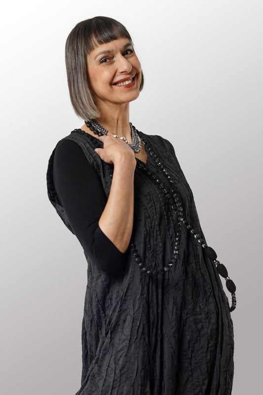 DYED COTTON SILK HEAVY VOILE RANDOM TUCK HIGH-NECK VEST - dr1244-blk -
