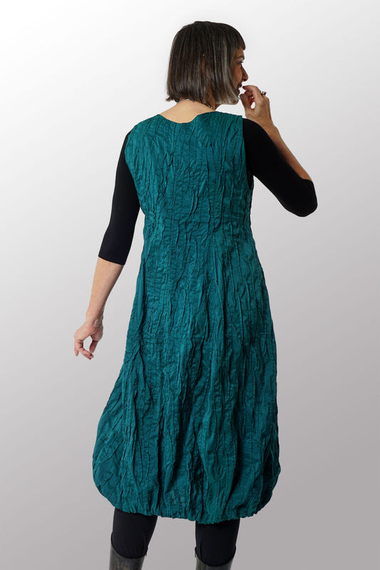 DYED COTTON SILK HEAVY VOILE RANDOM TUCK V-NECK BALLOON DRESS - dr1451-grn -