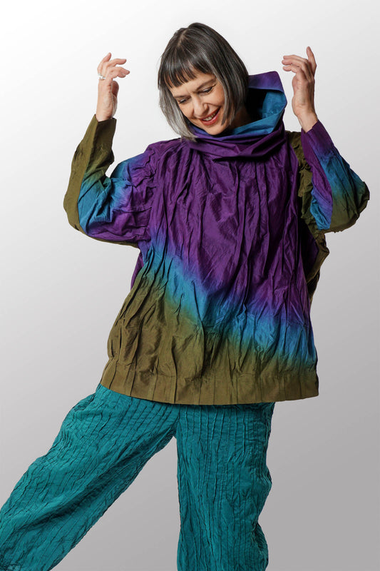 DYED COTTON SILK HEAVY VOILE WAVY TUCK HIGH NECK RAGLAN TOP - dh1581-stl -