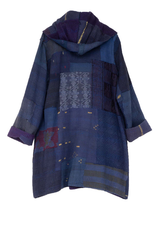 FRAYED PATCH KANTHA HOODED POCKET COAT - fi4303-nvy -