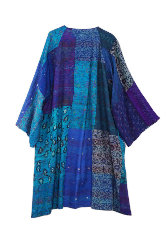 GEORGETTE VINTAGE SILK PATCH KANTHA KIMONO DUSTER - gs2317-blu -
