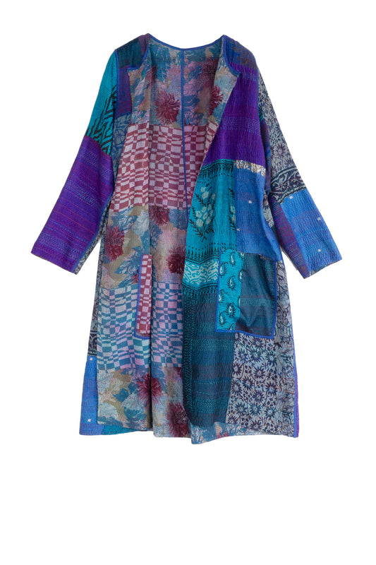 GEORGETTE VINTAGE SILK PATCH KANTHA CREW NECK COAT - gs2313-blu -
