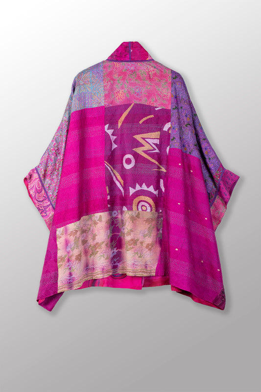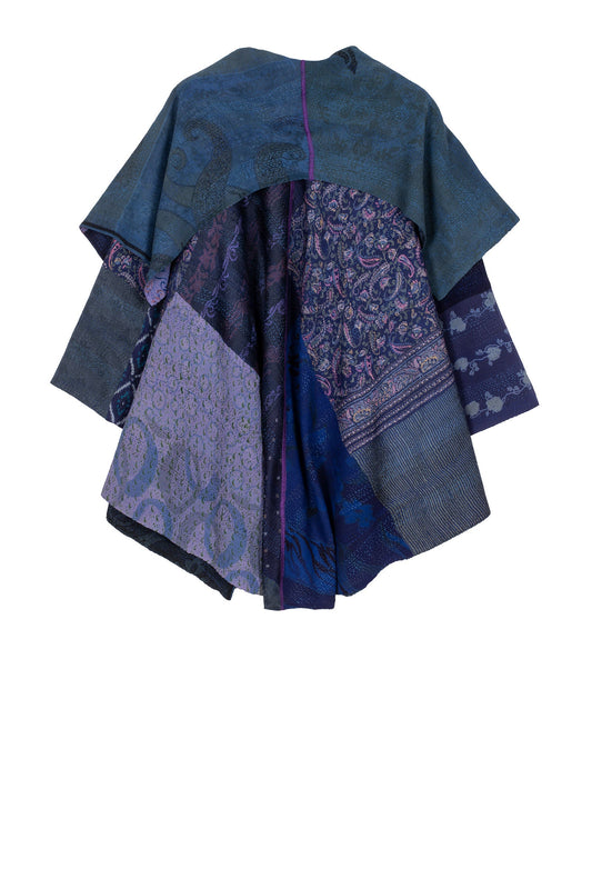 GEORGETTE VINTAGE SILK PATCH KANTHA DOUBLE COLLAR PONCHO - gs2323-pik -