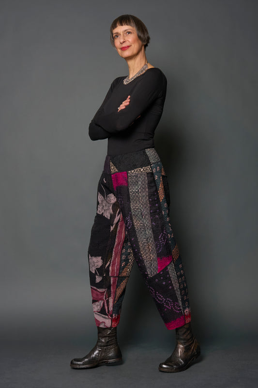 JACQUARD SILK KANTHA PANELED LANTERN PANTS - js4675-blk -
