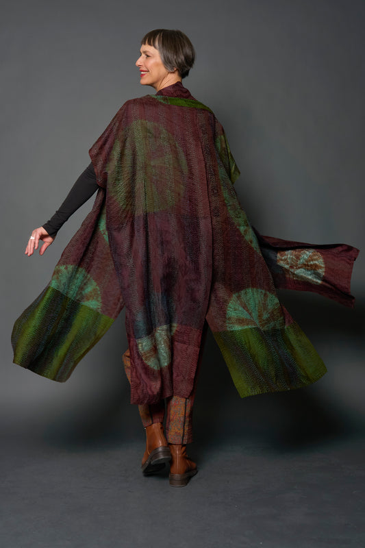 JACQUARD SILK PATCH TIE DYE CIRCLE SHIBORI KANTHA NEW OVERSIZED COAT - wj2342-grn -