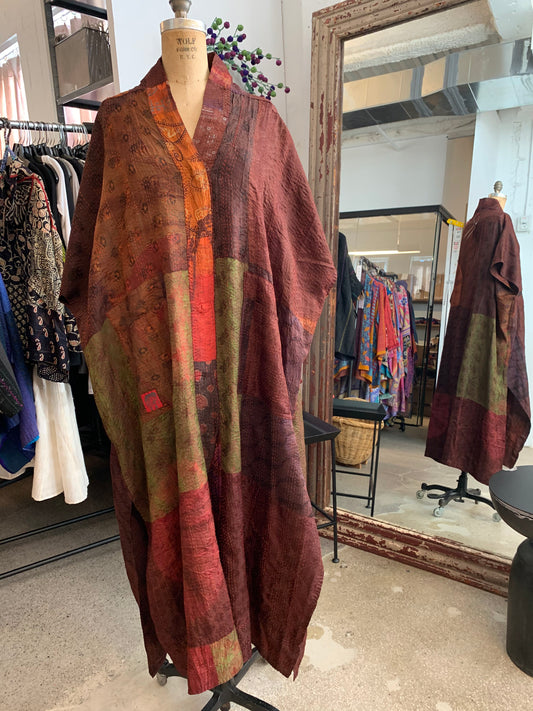 JACQUARD SILK PATCH TIE DYE CIRCLE SHIBORI KANTHA PONCHO DRESS - wj2443-brn -