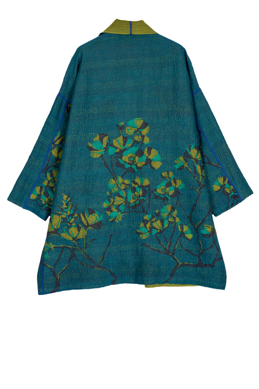 BLOOMING FLOWERS KANTHA KIMONO LONG JACKET - bf4005-blu -