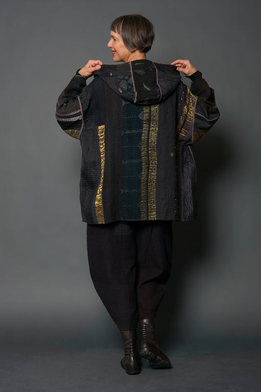 JEWEL WOVEN WITH VERTICAL PATCH KANTHA HOODIE PONCHO - jv4064-blk -