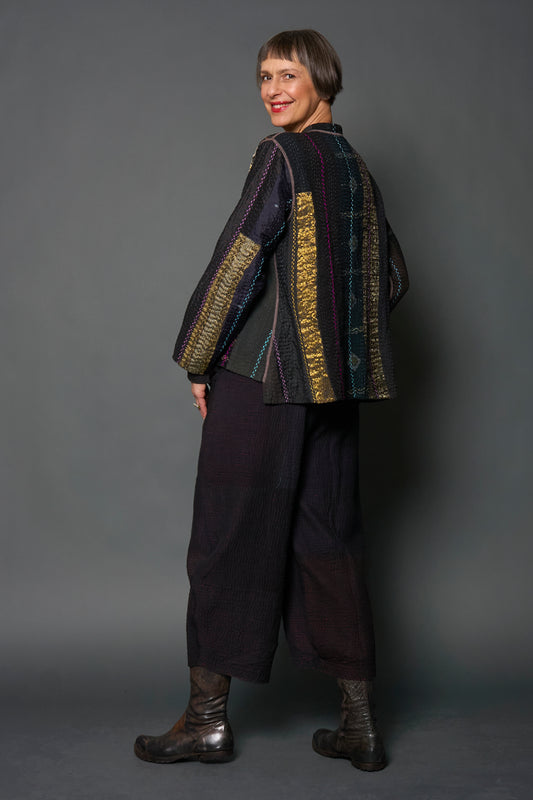 JEWEL WOVEN WITH VERTICAL PATCH KANTHA KAFTAN JACKET SHORT - jv4088-blk -