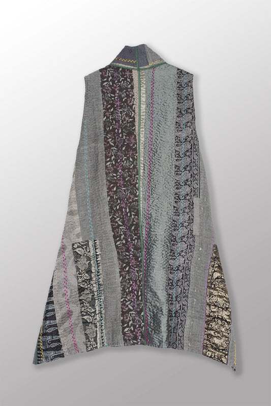 JEWEL WOVEN WITH VERTICAL PATCH KANTHA KIMONO VEST - jv4247-gry -