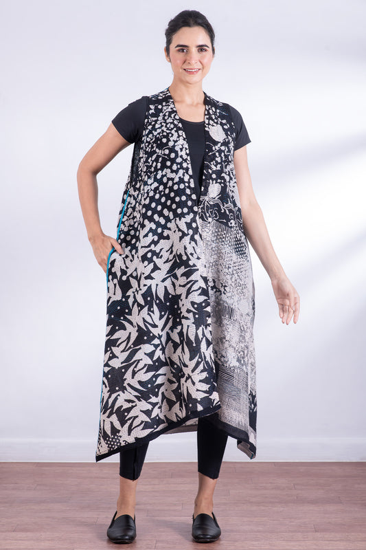 MONOTONE TWILIGHT PRINT KANTHA BACK PLEATED VEST MAXI - tp2222-blk -