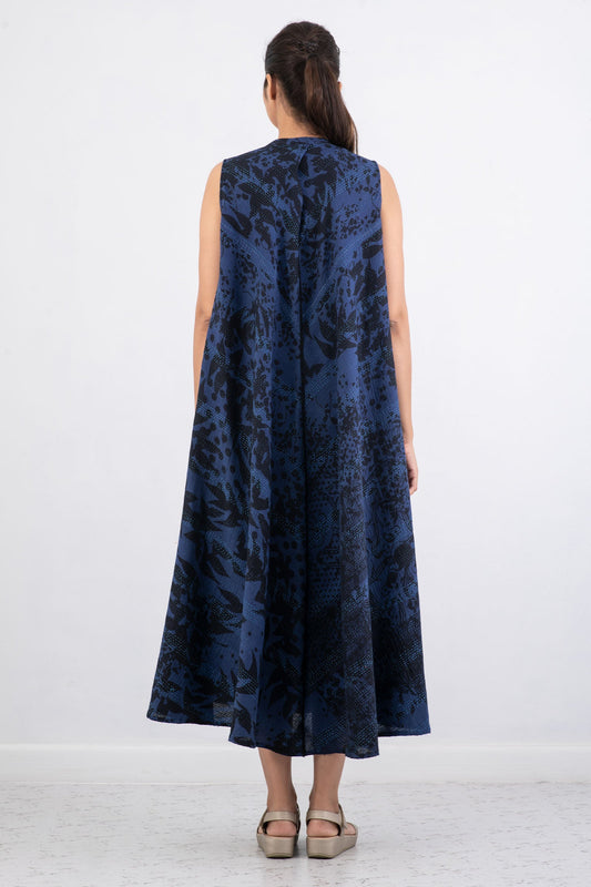 MONOTONE TWILIGHT PRINT KANTHA BAND COLLAR MAXI DRESS - tp2439-nvy -