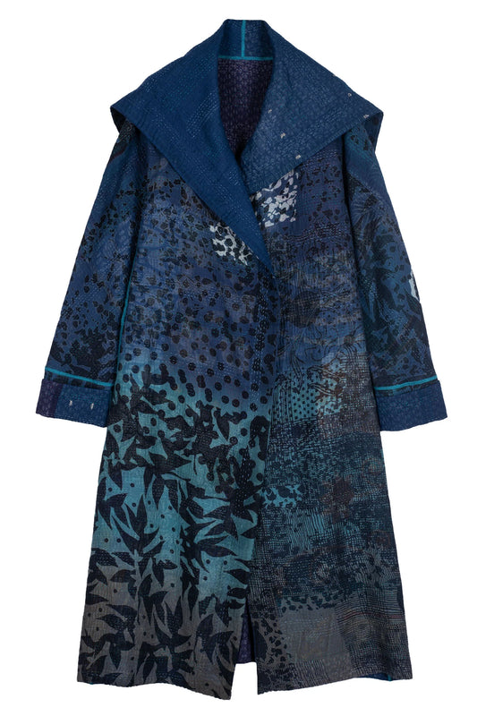MONOTONE TWILIGHT PRINT KANTHA A-LINE LONG COAT - tp4302-blu -