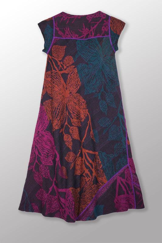 NIGHT FLOWERS KANTHA CAP SLV. SEMI FLARE DRESS - nl4452-prp -