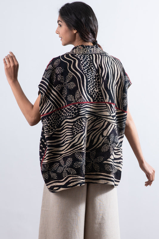 PATCH & CIRCLE PRINT KANTHA WING COLLAR VEST - pc2207-blk -