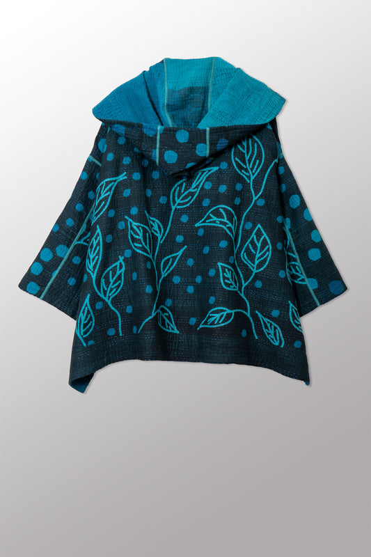POLKA DOTS & LEAVES KANTHA HOODIE PONCHO - dl4064-tuq -