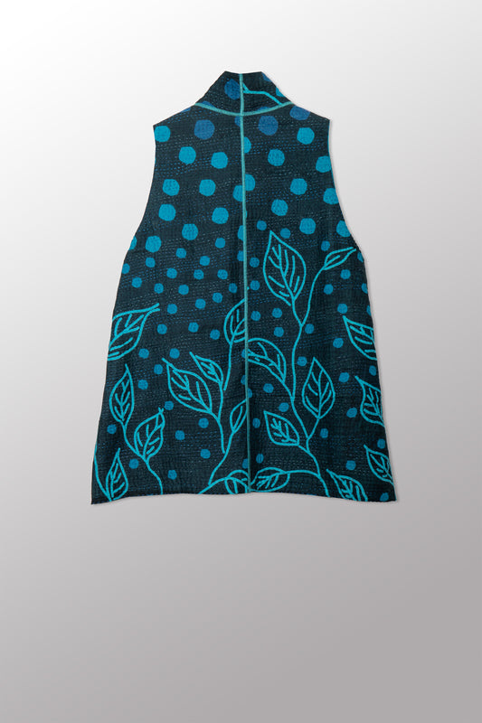 POLKA DOTS & LEAVES KANTHA BACK PLEATED VEST - dl4221-blu -