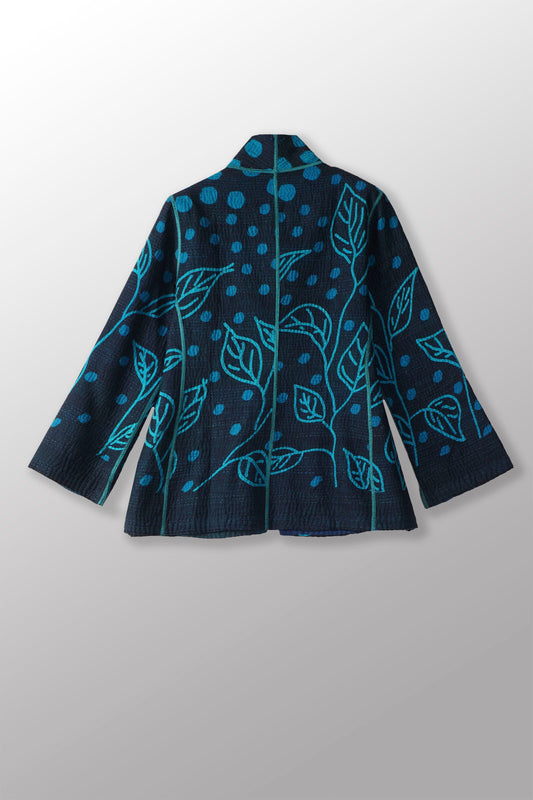 POLKA DOTS & LEAVES KANTHA TUCKED COLLAR JKT - dl4047-blu -