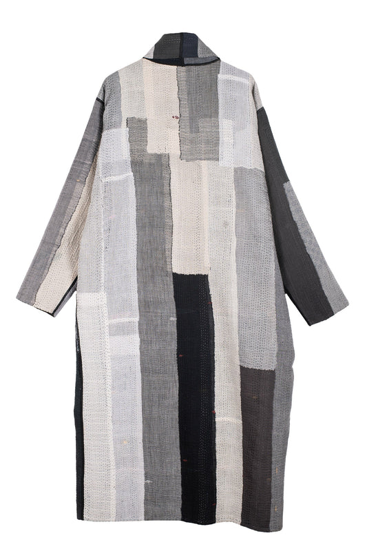 STRIPE AND CHECK COTTON SILK PATCH KANTHA ROBE COAT - ss4329-blk -