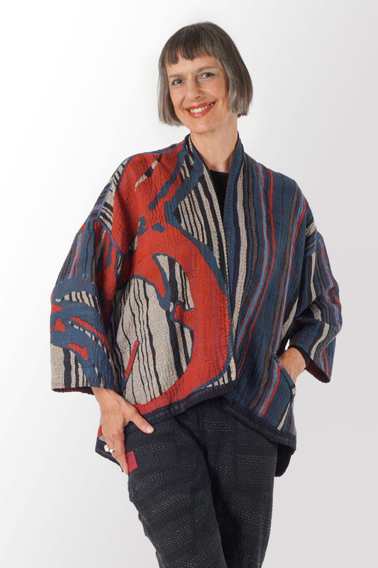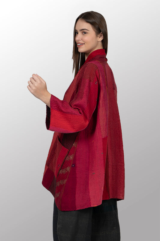 STRIPE AND BENDS KANTHA MINI KIMONO JACKET - sb4055-red -