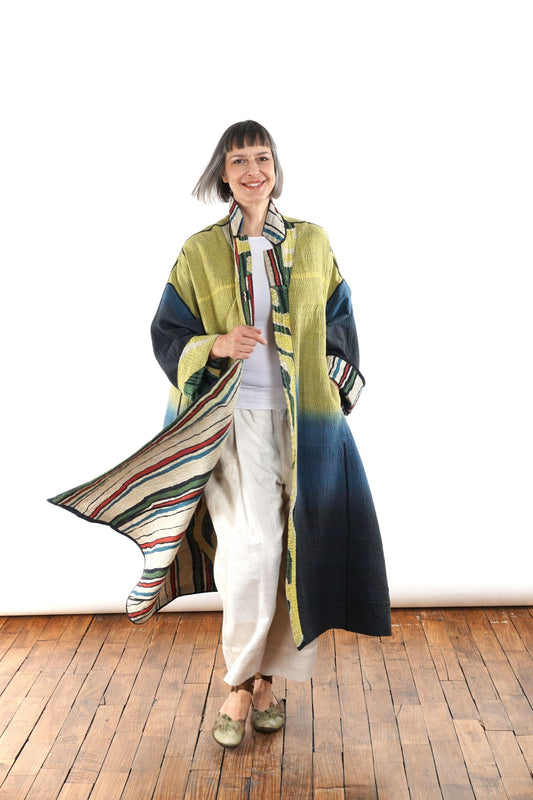 STRIPE AND BENDS KANTHA OVERSIZED COAT - sb4326-grn -