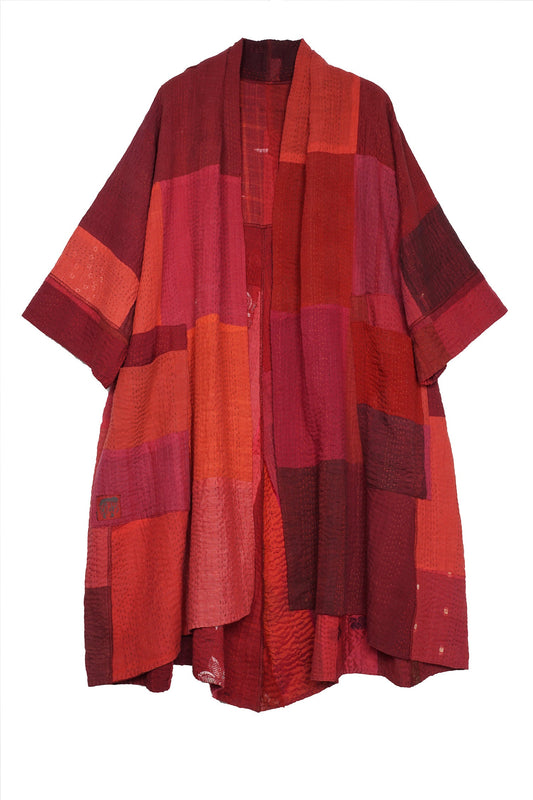 STRIPE AND CHECK COTTON SILK PATCH KANTHA 3/4 SLV. A-LINE DUSTER - ss4324-red -