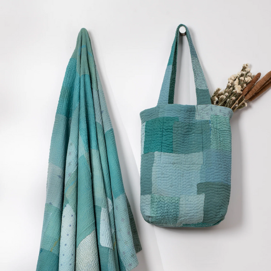 Mosaic Fray Handmade Vintage Kantha Tote Bag -Cornflower -
