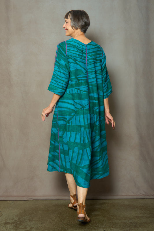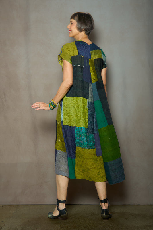 MARBLE FRAY PATCH KANTHA V-NECK FRENCH SLV. DRESS - mf2467-grn -
