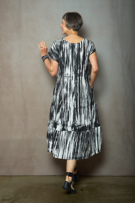 CAMBRIC TIE DYE RIPPLE TUCK V-NECK SHAPED MIDI DRESS - tr1465-blk -