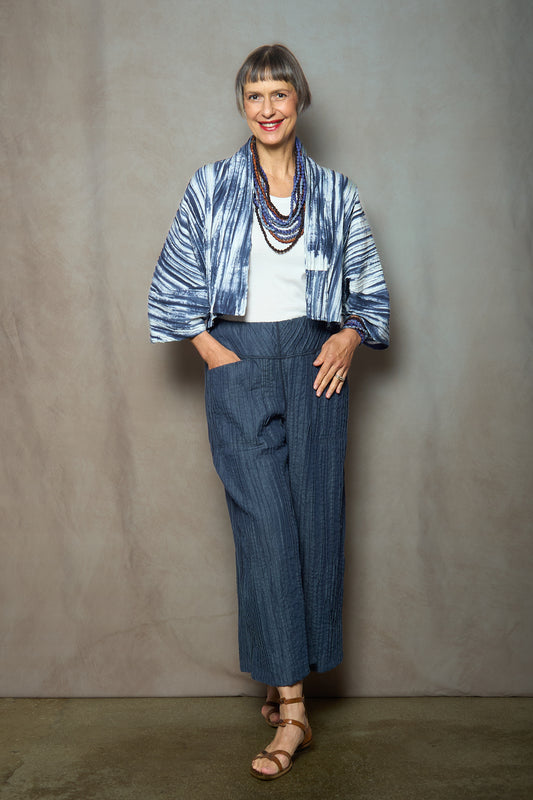 CAMBRIC TIE DYE RIPPLE TUCK LANTERN SLV. SHRUG - tr1j103-nvy -