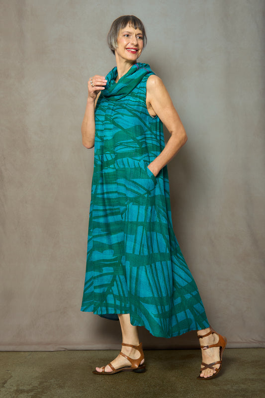 MARIGOLD PRINT WITH OVERDYE KANTHA COWL NECK MAXI DRESS - ov-mg2438-tuq -