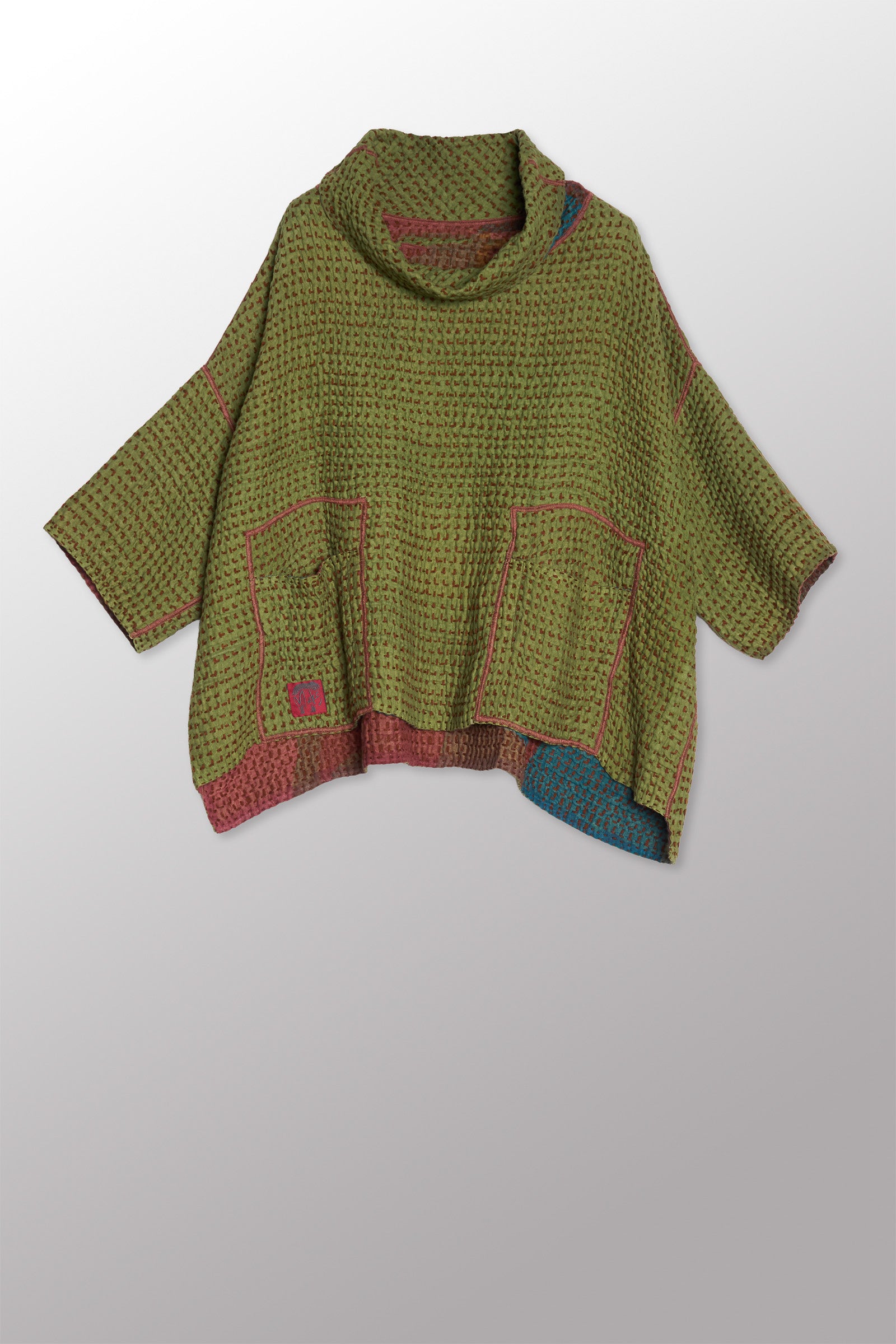 ABSTRACT WAFFLE KANTHA COWL NECK PONCHO - bw3061-red -