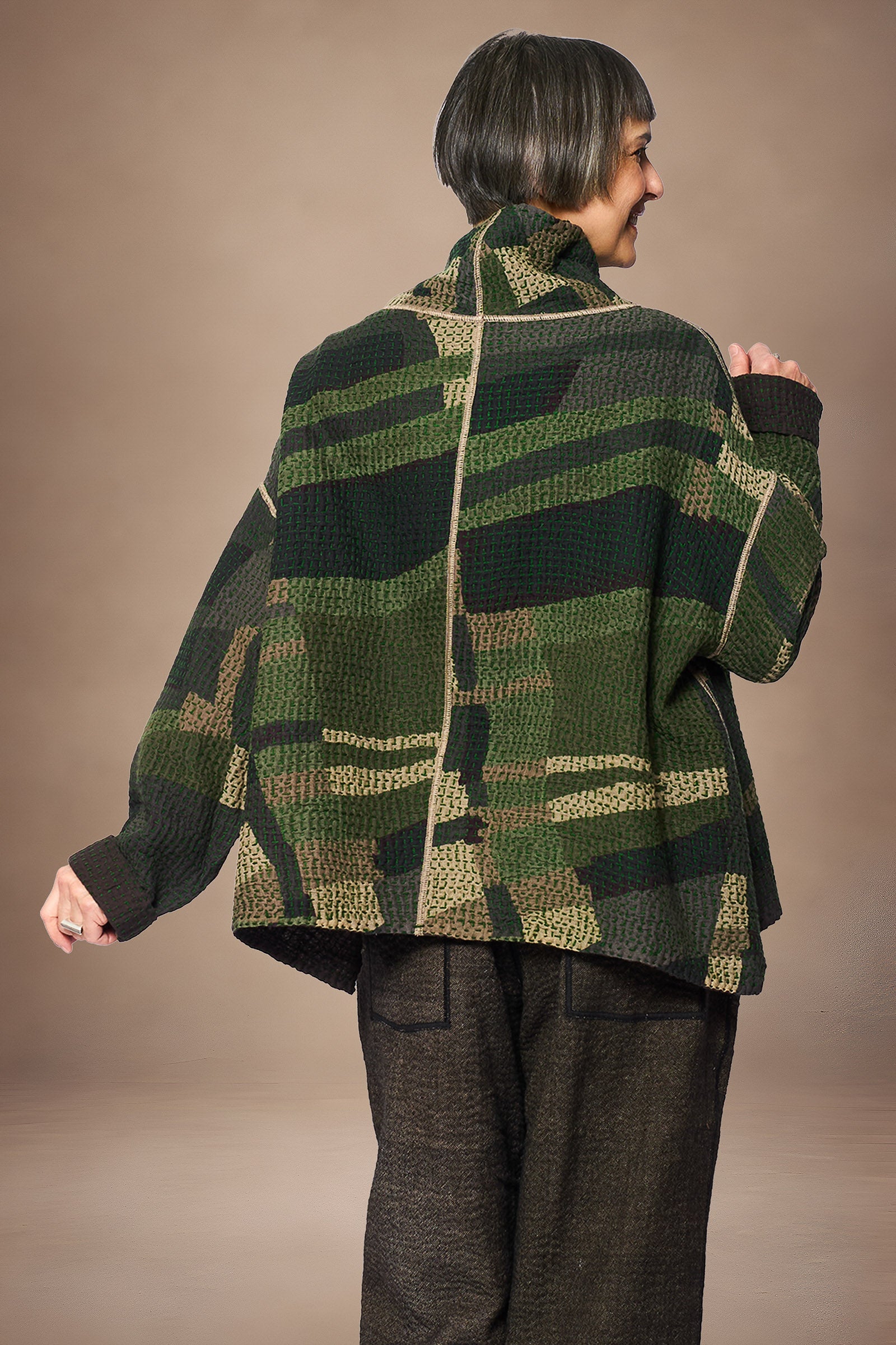 ABSTRACT WAFFLE KANTHA FUNNEL NECK PULLOVER - bw3t106-grn -