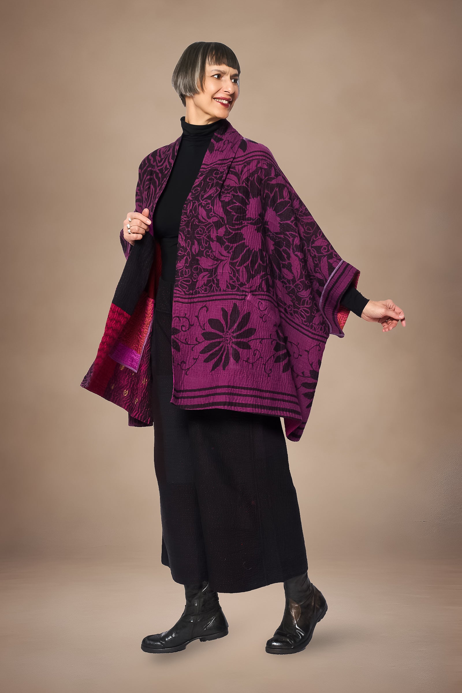 AMETHYST COTTON SILK KANTHA DOUBLE COLLAR PONCHO - oc4323-prp -