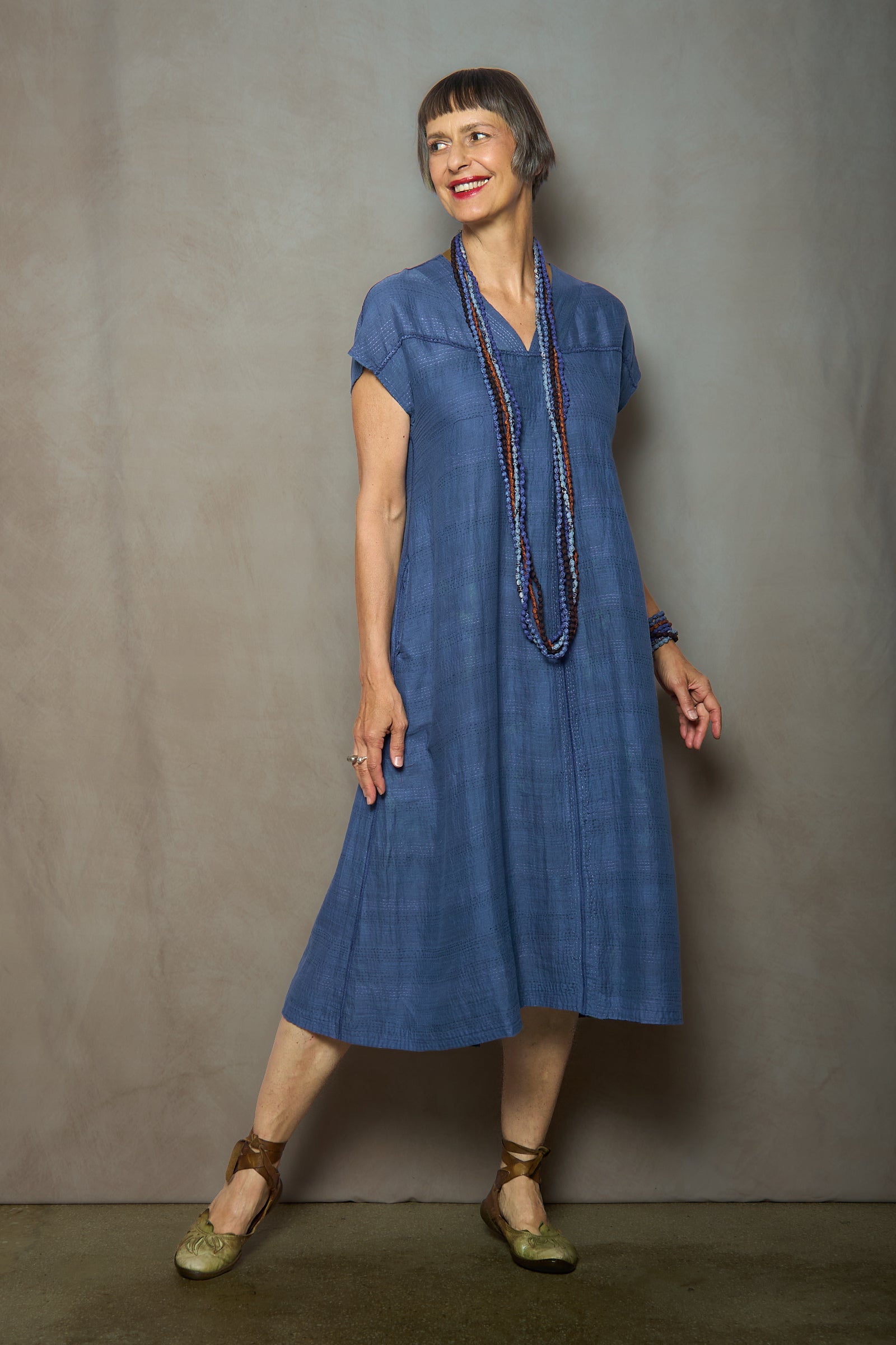 CLOUD TIE DYE FLORAL KANTHA V-NECK FRENCH SLV. DRESS - uf2467-blu -