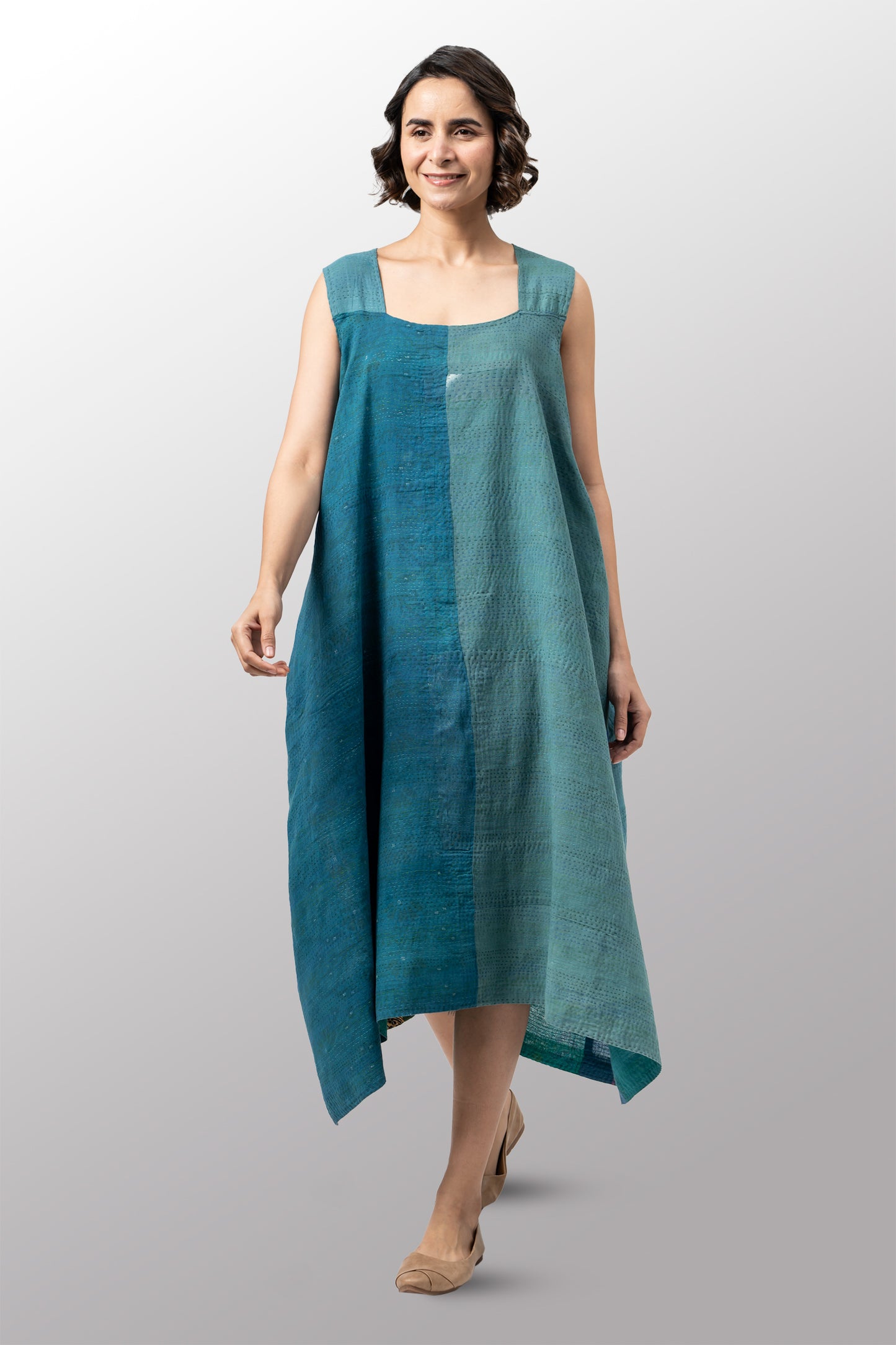 COTTON SILK SW PATCH OMBRE KANTHA TENT DRESS - ws2413-tel -