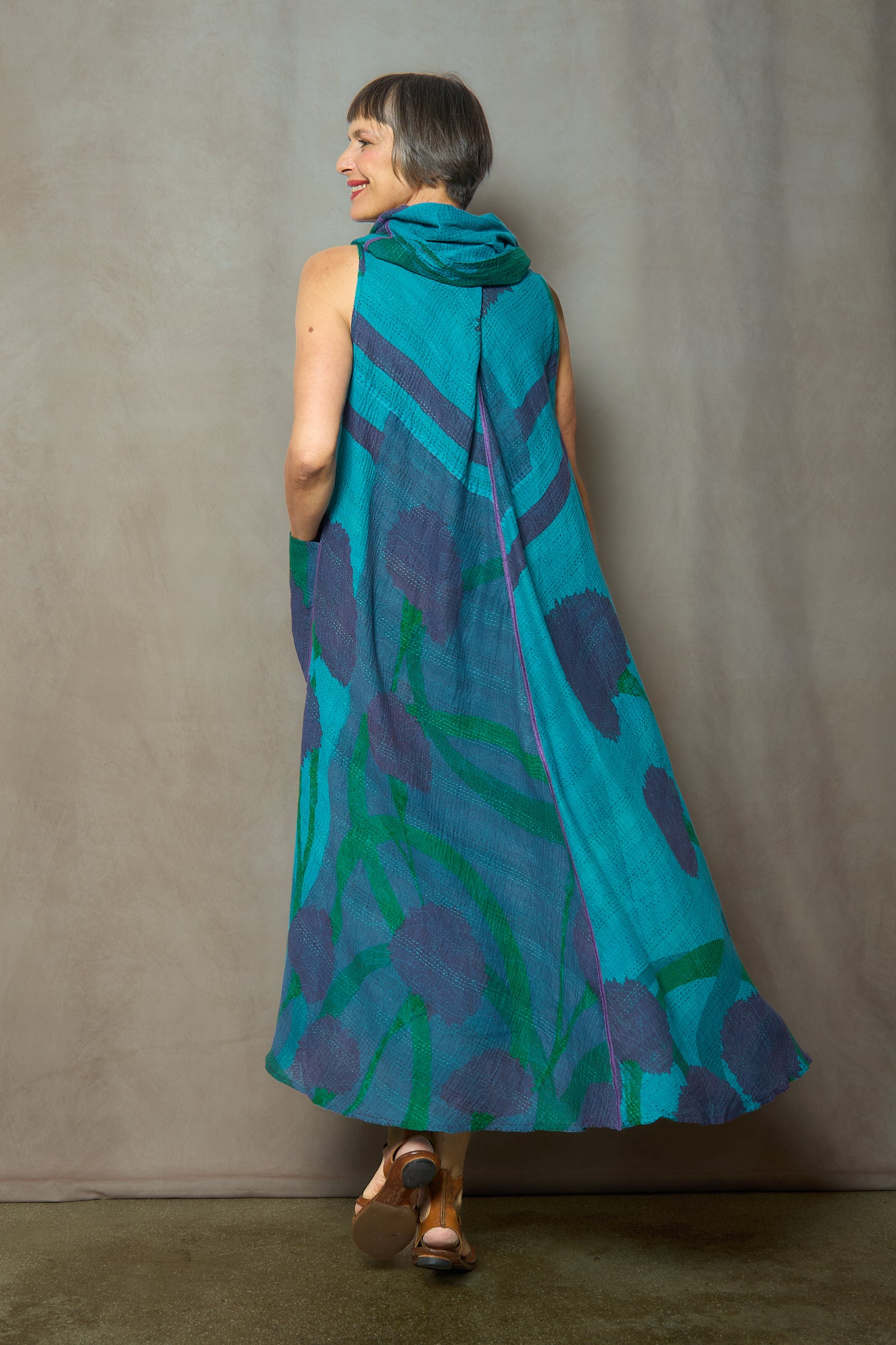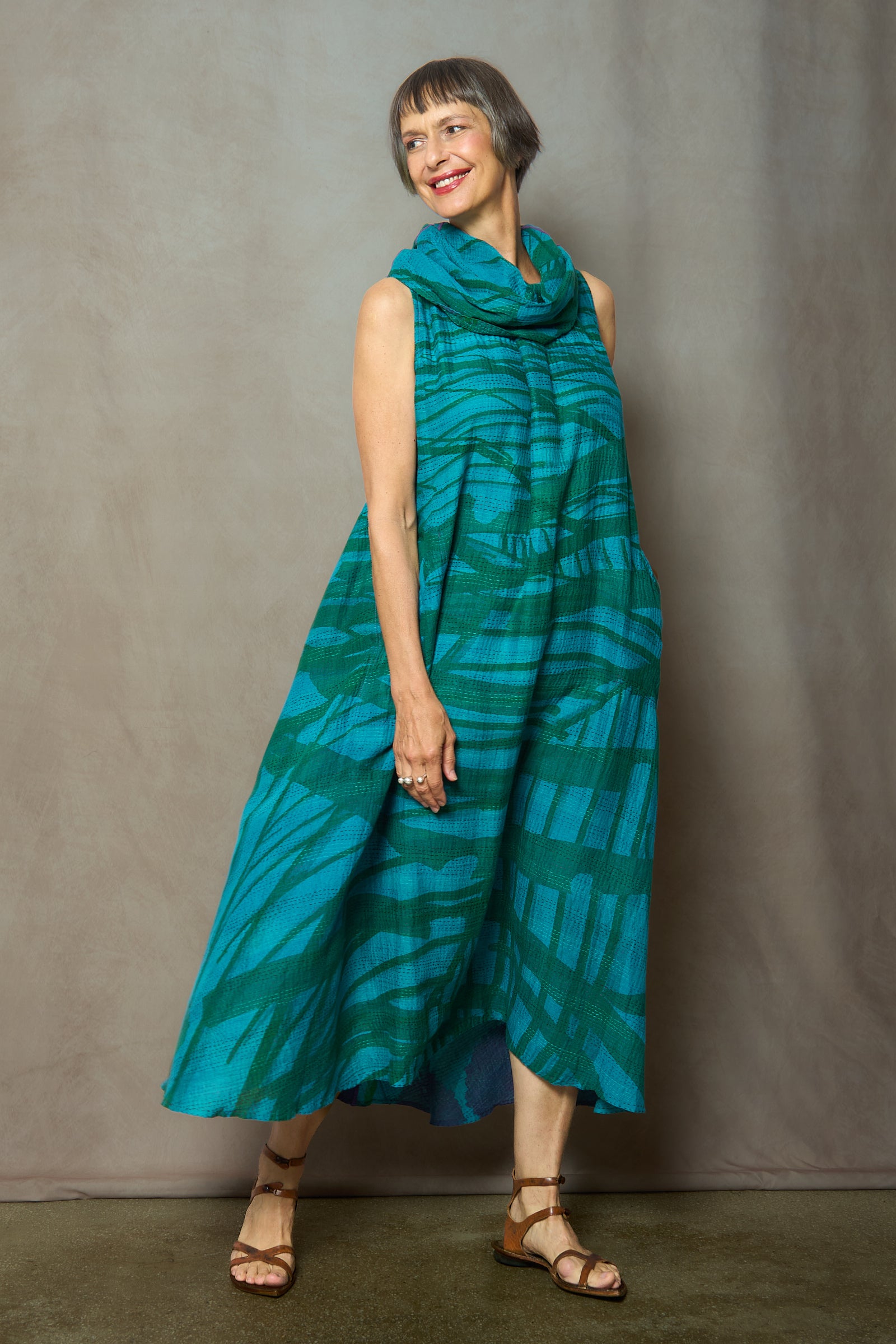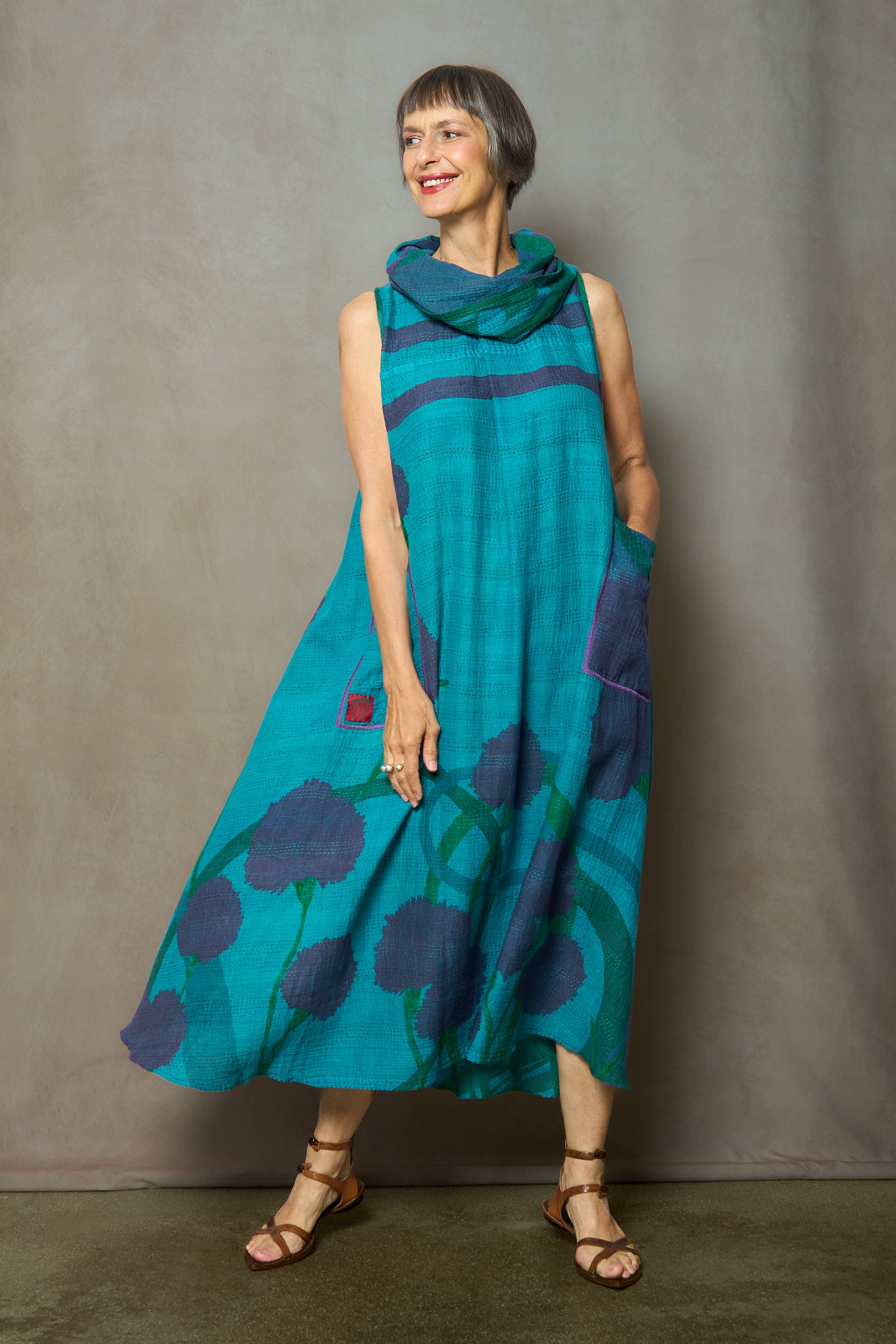 MARIGOLD PRINT WITH OVERDYE KANTHA COWL NECK MAXI DRESS - ov-mg2438-tuq -