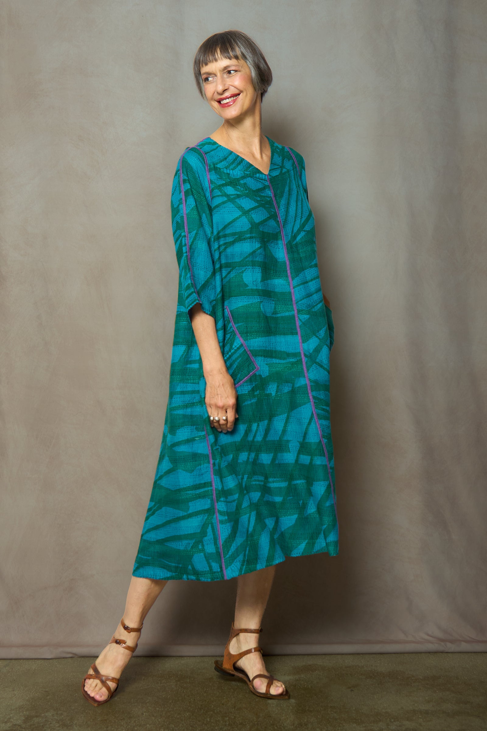 MARIGOLD PRINT WITH OVERDYE KANTHA V-NECK FLARE DRESS - ov-mg2457-tuq -